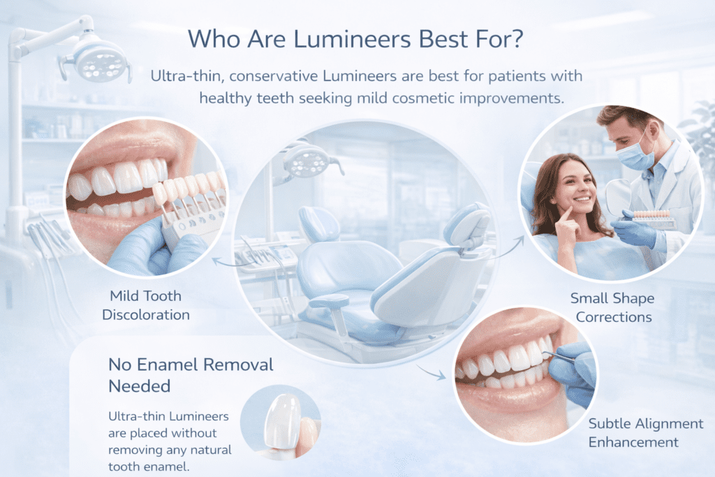 Lumineers are best suited for patients with healthy teeth who are looking for a quick cosmetic enhancement. They are ideal for mild smile improvements such as: